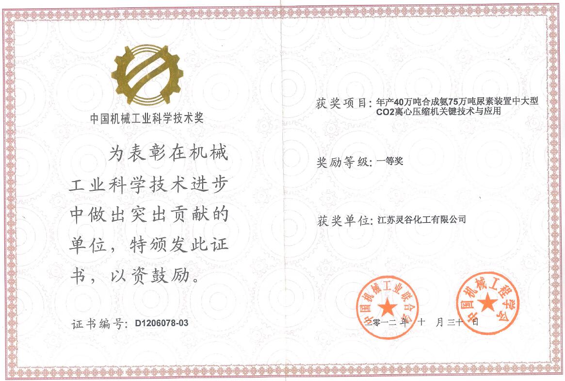 40万吨合成氨75万吨尿素装置中大型CO2离心压缩机关键技术与应用一等奖